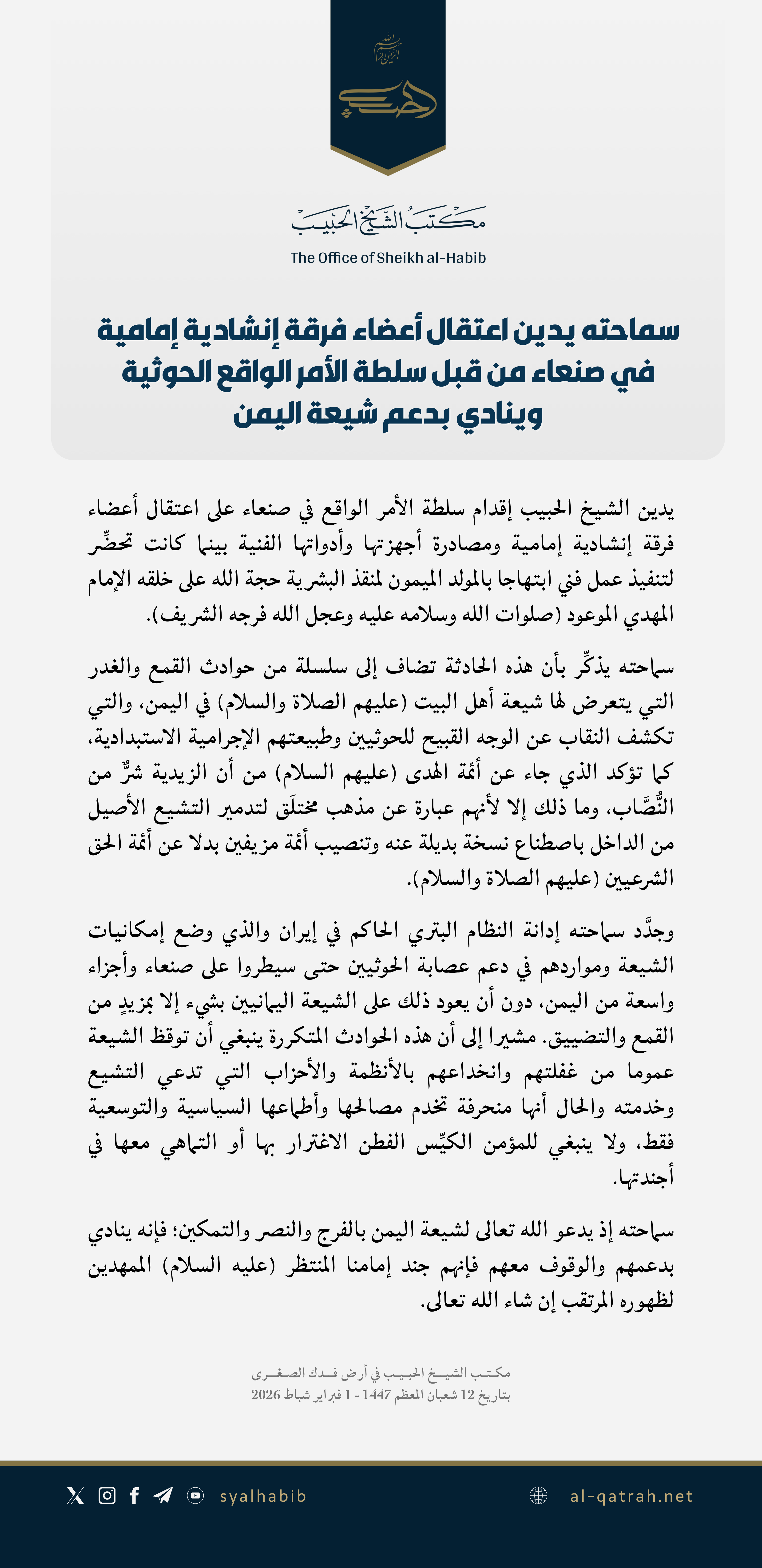 يدين الشيخ الحبيب إقدام سلطة الأمر الواقع في صنعاء على اعتقال أعضاء فرقة إنشادية إمامية ومصادرة أجهزتها وأدواتها الفنية بينما كانت تحضِّر لتنفيذ عمل فني ابتهاجا بالمولد الميمون لمنقذ البشرية حجة الله على خلقه الإمام المهدي الموعود (صلوات الله وسلامه عليه وعجل الله فرجه الشريف).